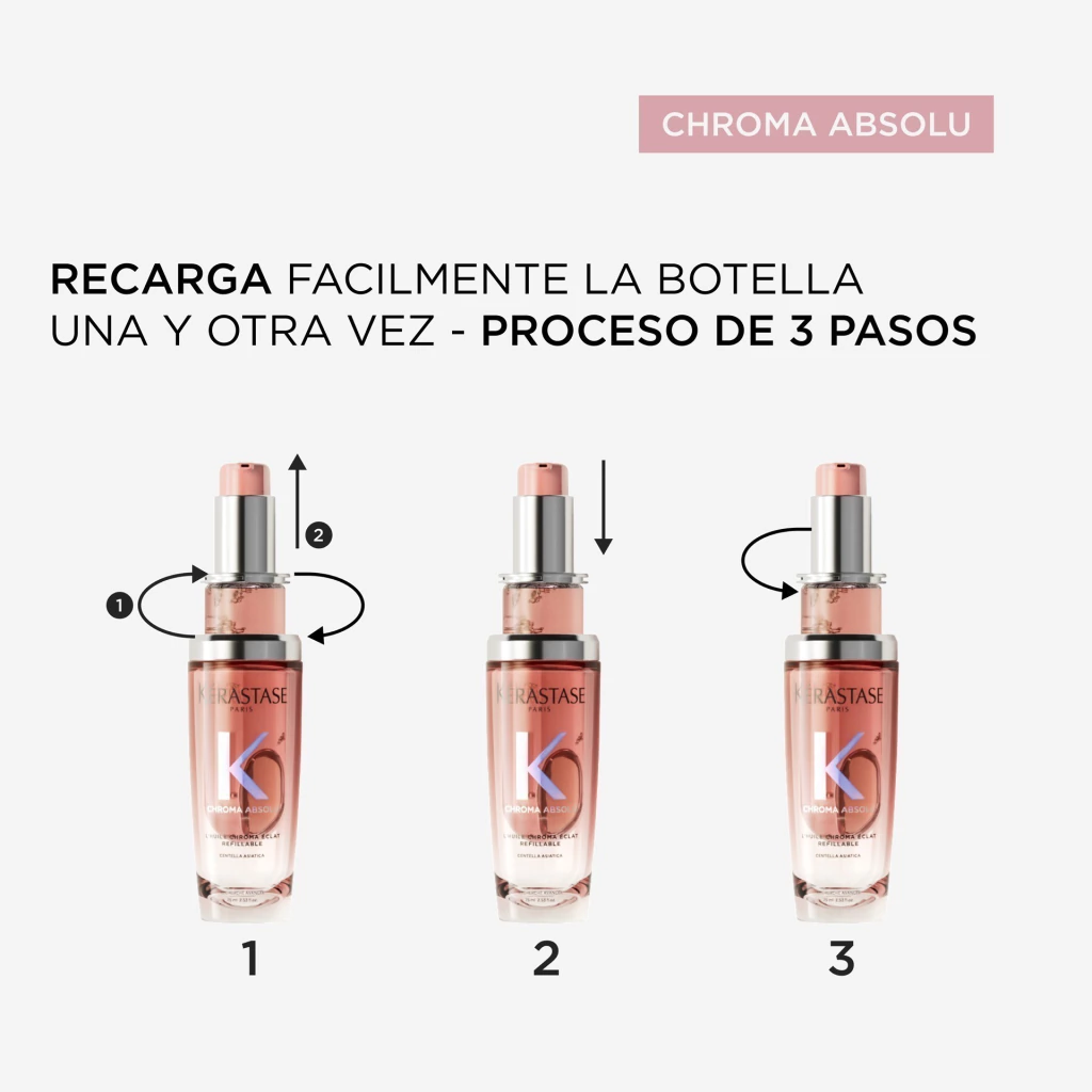 L'huile Chroma Éclat recargable proporciona al cabello teñido un brillo duradero. Enriquecido con Centella Asiática, una planta silvestre que crece en un entorno tropical, el aceite preserva el color del cabello y le aporta un brillo seductor y perfumado.